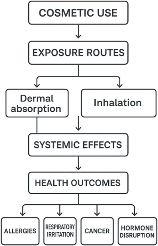 Figure 1 illustrates the pathway through which cosmetic use can lead to adverse health outcomes, emphasizing the mechanisms of exposure and subsequent systemic effects. It begins with the application of cosmetic products, which introduces potential contaminants into the body via two primary exposure routes: dermal absorption and inhalation. Dermal absorption occurs when substances penetrate the skin, while inhalation involves breathing in volatile compounds, sprays, or powders. Both routes can result in systemic distribution of these chemicals throughout the body, potentially disrupting normal physiological functions. This systemic exposure may lead to various health outcomes, including allergic reactions, respiratory irritation, cancer, and hormonal disruption. The diagram highlights the importance of understanding not just the ingredients in cosmetic products but also how they interact with the body over time, particularly through repeated use, which can amplify cumulative exposure and health risks.