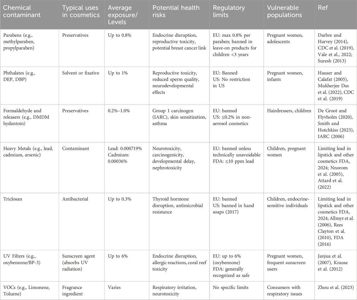 Table 1. Common cosmetic contaminants: uses, exposure, health risks, regulations, and vulnerable populations.