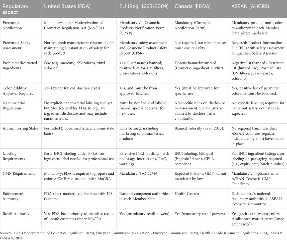 Regulatory frameworks for cosmetics may vary across regions, affecting how products are evaluated, labeled, and monitored. Table 2 compares key regulatory components across the United States, European Union, Canada, and ASEAN, highlighting differences in premarket requirements, safety assessments, ingredient restrictions, labeling, and enforcement mechanisms.
