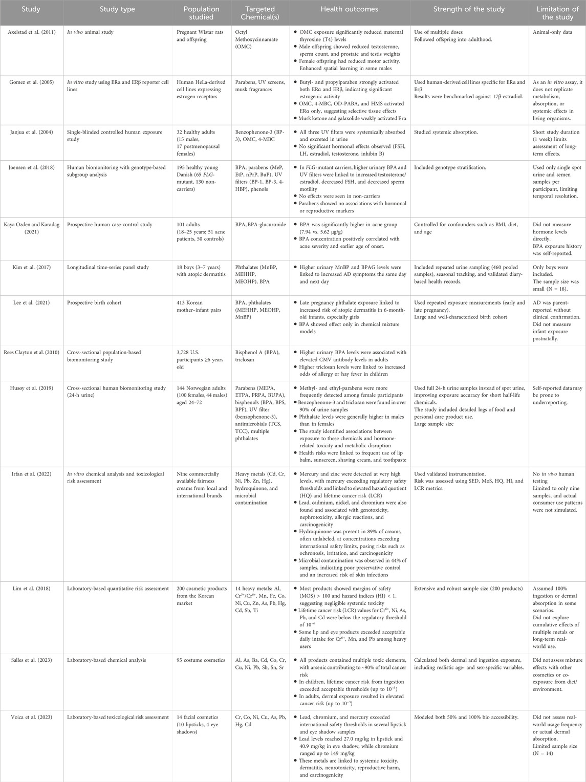 A laboratory-based analysis of 95 cosmetic products reported that all samples contained multiple toxic metals, including arsenic, lead, cadmium, chromium, and nickel (Salles et al., 2023). Arsenic was the dominant contributor to lifetime cancer risk (LCR), especially among children exposed via ingestion (LCR up to 10−5) and adults via dermal contact (LCR up to 10−3). Further raising these concerns, laboratory-based toxicological risk assessment of 14 facial cosmetics revealed that several lipsticks and eye shadows contained lead, chromium, and mercury at concentrations far exceeding international safety limits. Lead levels reached 27.0 mg/kg in lipstick and 40.9 mg/kg in eye shadow, while chromium was as high as 149 mg/kg and mercury up to 138 mg/kg (Voica et al., 2023). These metals are associated with carcinogenicity. On the other hand, another large-scale laboratory risk assessment analyzed 200 cosmetic products from the Korean market and found that most heavy metals, including chromium, lead, cadmium, mercury, and arsenic, posed negligible cancer and systemic toxicity risks under normal use (Lim et al., 2018). Lifetime cancer risk (LCR) and hazard indices (HI) for all metals remained below safety thresholds. However, a subset of lip and eye products used by heavy consumers exceeded acceptable daily intake levels for Cr6+, Mn, and Pb, suggesting targeted concern for frequent users. These findings highlight the importance of product-specific use patterns and support routine monitoring to ensure safety across varying levels of cosmetic use.