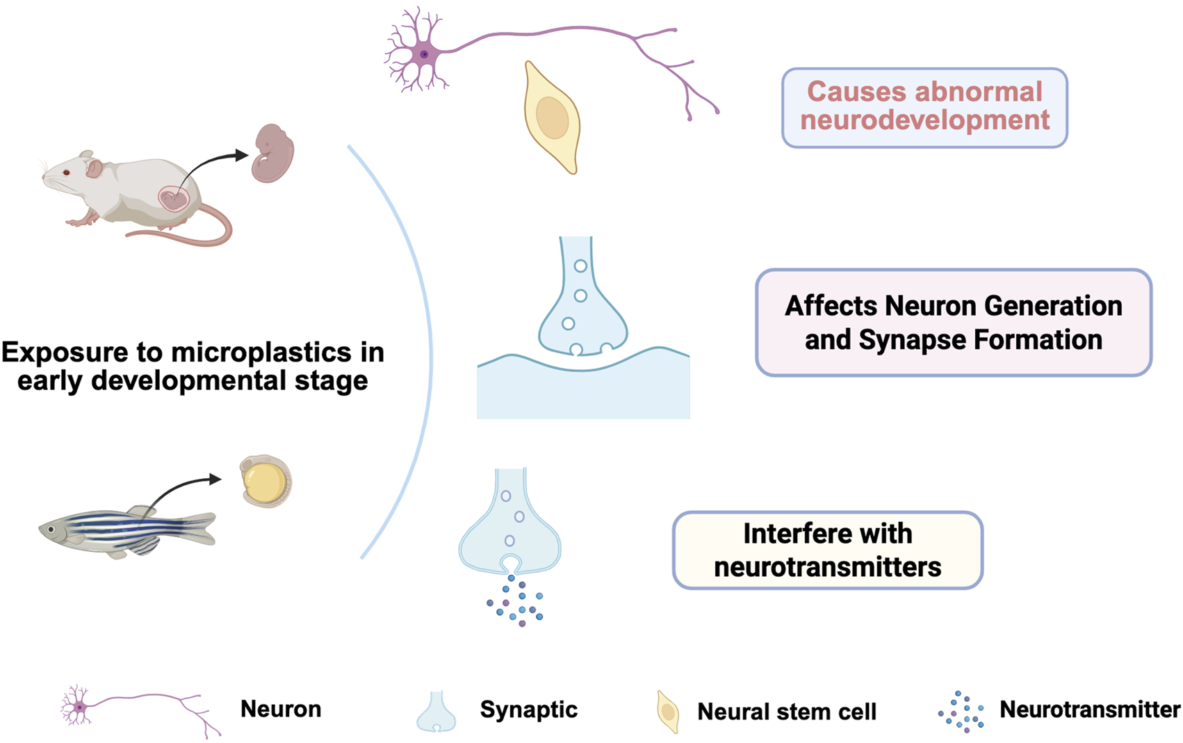 Figure 2. Influence of microplastics on early neural development. In the early stages of development, exposure to microplastics may cause abnormal neurodevelopment, alter the formation of neurons and synapses, and interfere with neurotransmitters.