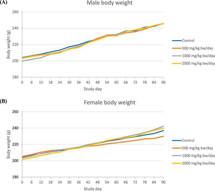 Figure 1. Body weight in 90-day repeated dose toxicity study with Organic Lion’s Mane M2-102-10 powder ((A)=Male, (B): Female).