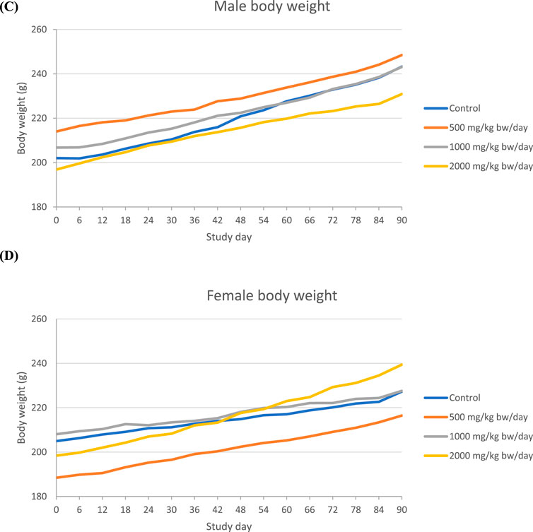 The 90-day oral toxicity studies were conducted in accordance with the OECD Guidelines for Testing of Chemicals, No. 408 (OECD, 2018). Wistar rats (10 animals per sex per group) were assigned to treatment groups and received the test substance suspended in purified water via oral gavage at daily dose levels of 0, 500, 1,000, or 2,000 mg/kg body weight for a duration of 90 days. Before dosing, animals were fasted overnight and remained without food for an additional 2–4 h following administration. Drinking water was available without restriction, and animals were provided with food each day. All animals underwent a 5-day acclimation period prior to the initiation of dosing. Environmental conditions were maintained with 10–15 air exchanges per hour, at a temperature range of 22 °C ± 3 °C, and relative humidity maintained between 40% and 60%. A 12-h light/dark cycle was established using artificial fluorescent lighting. Animals in all groups were monitored daily for clinical signs, morbidity, and mortality. Body weights were recorded on Day 0 (prior to the first treatment dose) and subsequently, at 12-day intervals throughout the study.