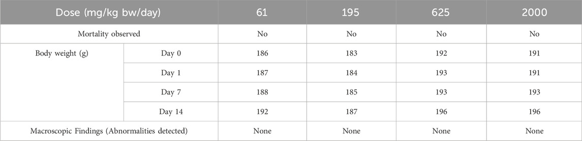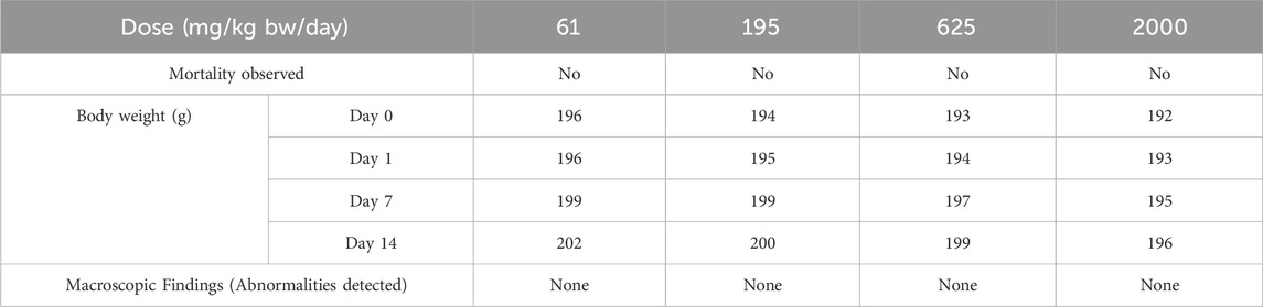The acute oral toxicity studies were carried out in accordance with the Organization for Economic Cooperation and Development (OECD) Guidelines for the Testing of Chemicals, Test Guideline No. 425 (OECD, 2022).