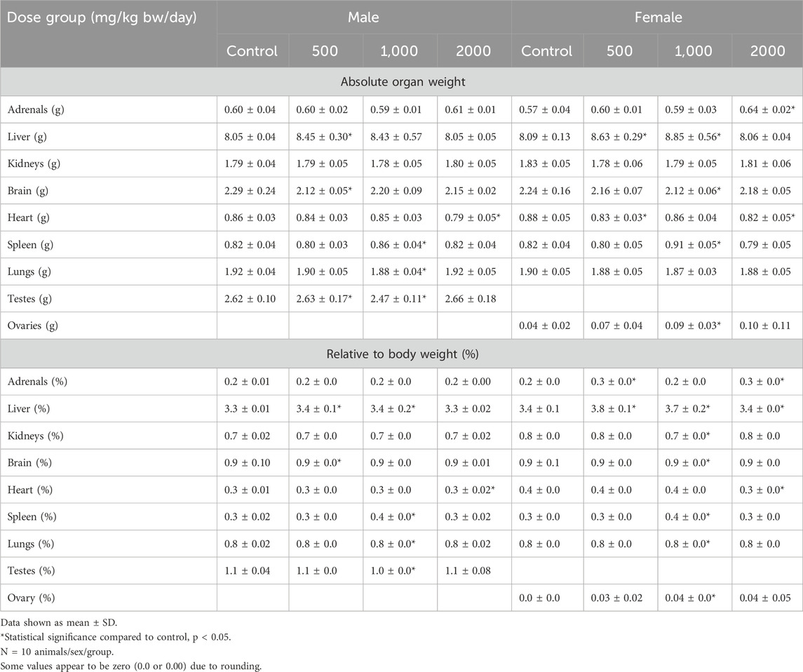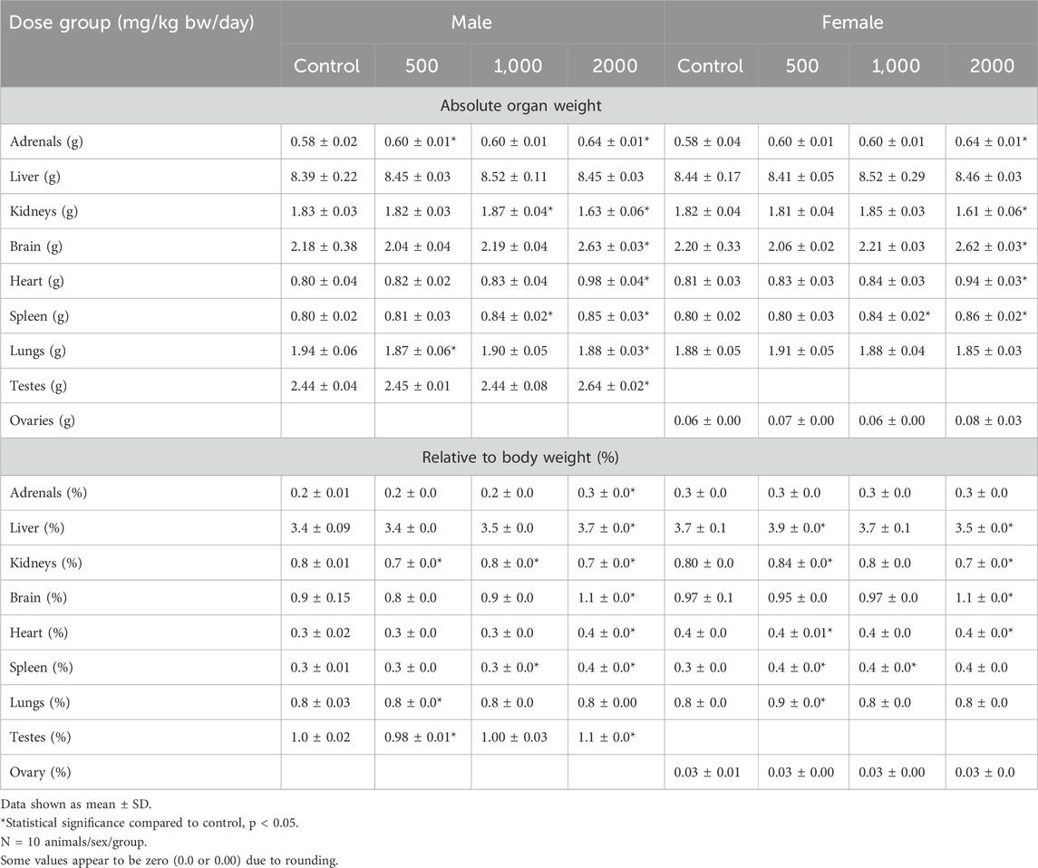 At study termination, necropsies were carried out on all animals. Absolute organ weights were recorded for the adrenals, brain, kidneys, lungs, heart, spleen, testes, uterus, and ovaries. Relative organ weights were calculated by dividing the absolute organ weight by the final body weight of each animal and expressing the result as a percentage. Histopathological assessments were subsequently carried out on tissues collected from the control and high dose group animals (FAO/WHO, 2011). Organs examined comprised the liver, kidneys, lungs, heart, brain, stomach, spleen, testes (with seminiferous tubules), uterus (including the cervix), and ovaries. In addition, lungs from animals belonging to the low- and mid-dose groups were examined histologically for potential signs of infection.