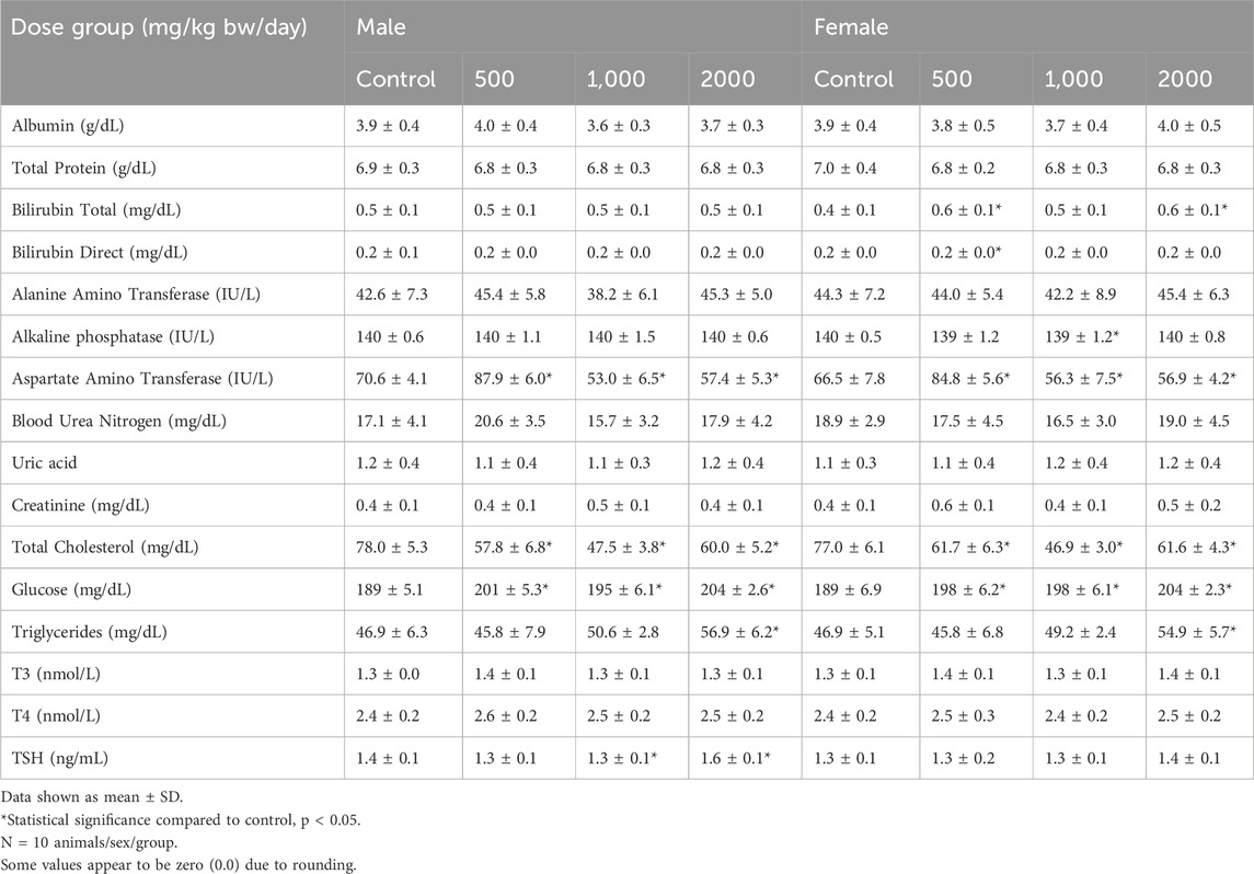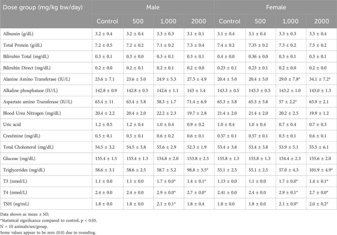 Only a few clinical chemistry parameters showed significant changes (Table 7). Alanine Amino Transferase was significantly increased (p < 0.05) in female rats at higher doses compared to the control group. Triglycerides increased significantly (p < 0.05) in the 2000 mg/kg bw/day dose group in both sexes compared to the controls. The thyroid hormones (T3, T4, TSH) also showed a statistically significant increase (p < 0.05) at higher doses in males and females.