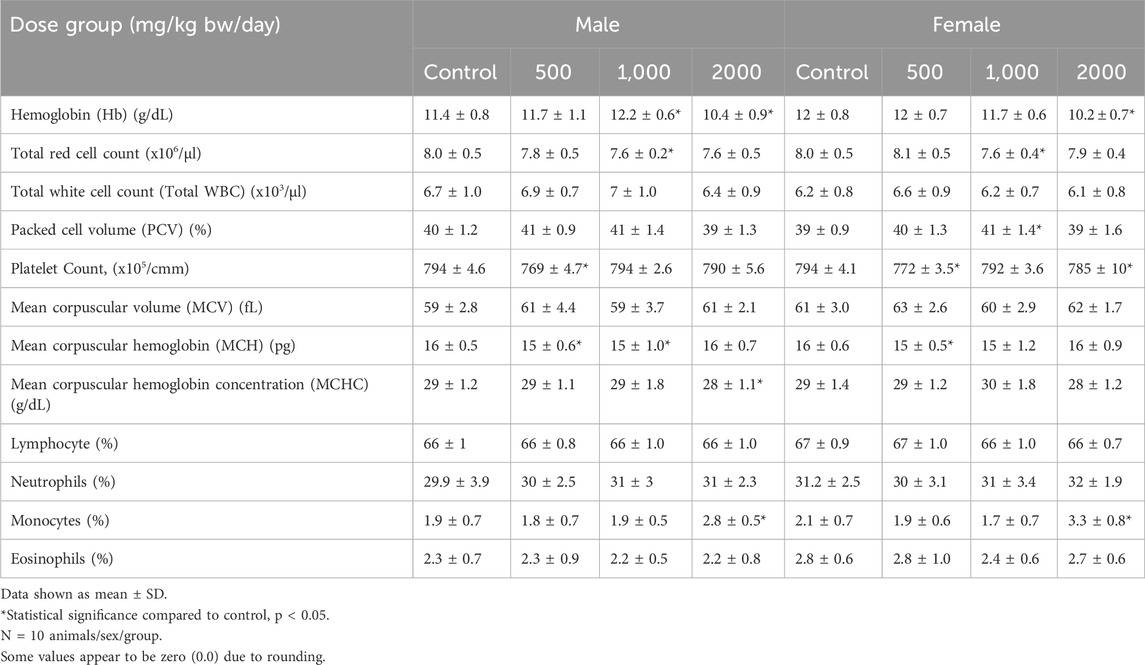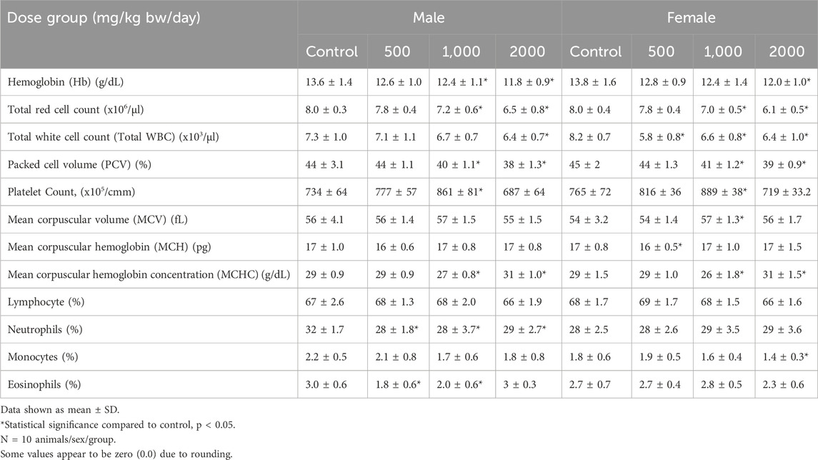 Hematological parameters (Table 8) indicated a statistically significant (p < 0.05) decrease in hemoglobin, total red blood cell count, total WBC, packed cell volume in male and female rats at higher doses compared to control groups. Mean corpuscular volume (MCV) was significantly increased only in female rats at only the 1,000 mg/kg bw/day dosage in comparison to the control group. A statistically significant (p < 0.05) decrease in the mean corpuscular hemoglobin concentration (MCHC) was noted at 1,000 mg/kg bw/day and a significant increase at 2000 mg/kg bw/day in both males and females. Neutrophils and eosinophils were significantly (p < 0.05) lower at higher doses in male rats compared to the control group. A statistically significant (p < 0.05) reduction in monocytes was observed only in female rats in only the 2000 mg/kg bw/day dose group compared to the control.