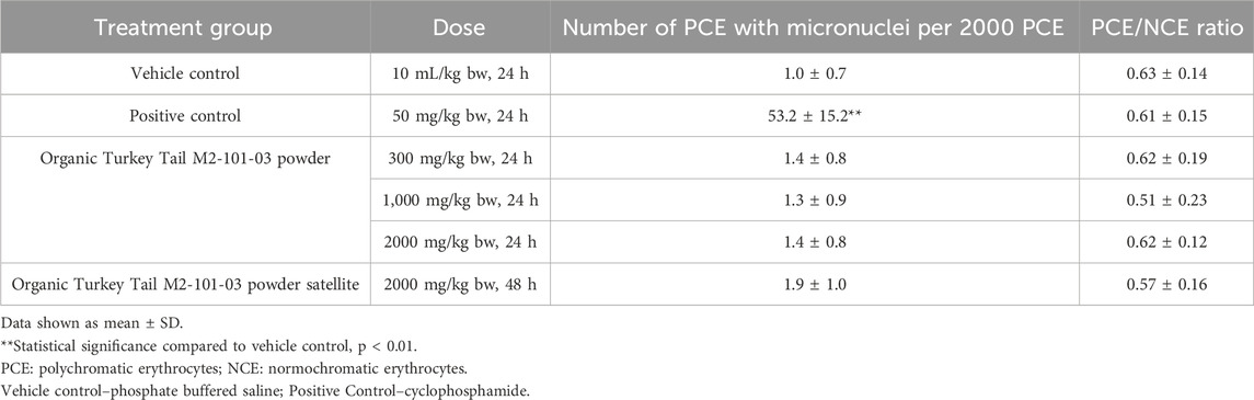 An in vivo micronucleus test was carried out to assess the clastogenic and/or aneugenic potential of Organic Lion’s Mane M2-102-10 powder and Organic Turkey Tail M2-101-03 powder. The study followed OECD Test Guideline No. 474 (OECD, 2014). The test materials were suspended in purified water prior to administration, with phosphate-buffered saline serving as the vehicle control. Cyclophosphamide (50 mg/kg bw), a known genotoxic agent, was used as positive control. Swiss albino mice (five males and five females per group), were used in each study. Test groups received oral gavage doses of 0 (control), 300, 1,000, or 2,000 mg/kg bw of either Organic Lion’s Mane M2-102-10 powder or Organic Turkey Tail M2-101-03 powder or the positive control. A satellite group also received 2,000 mg/kg bw to assess potential delayed effects. Dosing was conducted twice at 14-h intervals. The animals in the treatment, vehicle, and positive control groups were euthanized 24 h after the final dose. Animals from the satellite group were euthanized after 48 h post final administration. Bone marrow samples were collected and processed for micronucleus analysis, including staining, fixation, and microscopic examination at ×100 magnification. For each animal, micronucleated polychromatic erythrocytes (PCEs) were counted from 2,000 cells. Additionally, normochromatic erythrocytes (NCEs) were counted in a sample of 1,000 erythrocytes to determine the frequency of micronucleated NCEs. The ratio of PCE to NCE was calculated, and mean values with standard deviations were determined for each group.