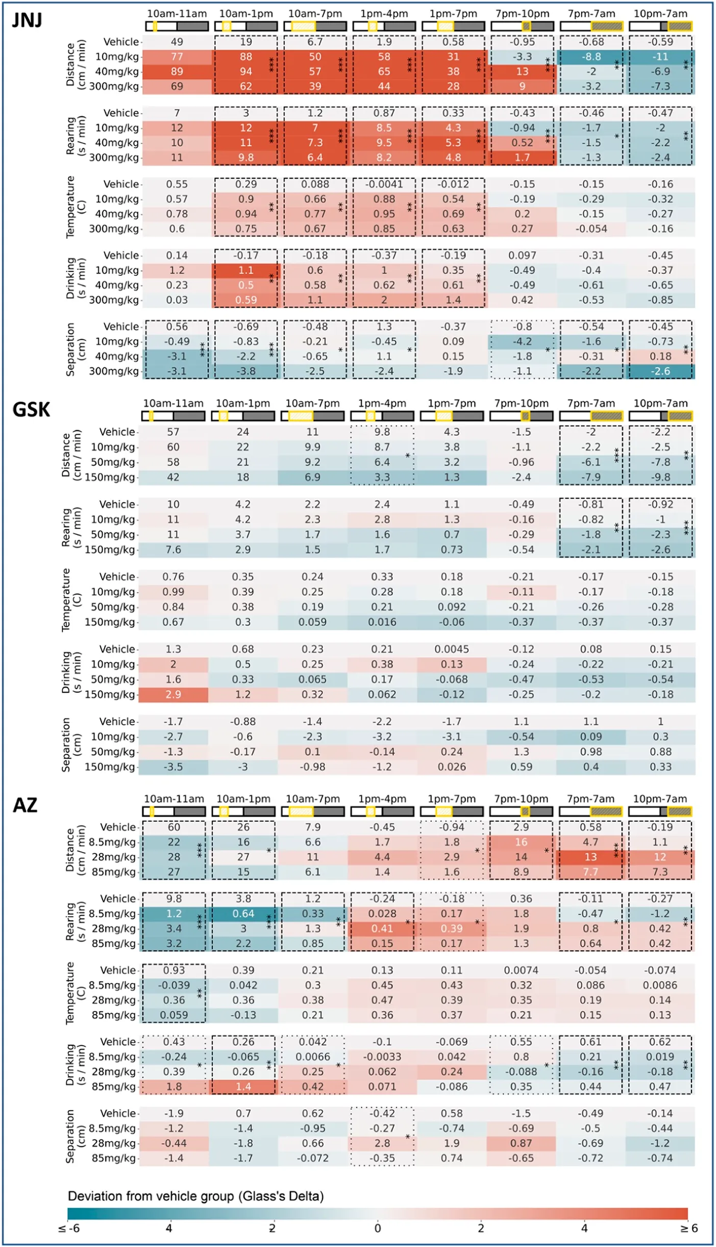 Dosing day results for all three compounds Baseline-corrected measurements are shown here for all three compounds JNJ, GSK and AZ. In each case all five measurements captured by the HCA system are shown, across a common “super-set” of time windows–encompassing all time windows considered in our initial blinded exploratory analyses. For each parameter/time-window, the average (n = 6) baseline-adjusted measurements are shown for each dose level: for all non-zero dose levels these entries are coloured by their deviation from the Vehicle measurements (calculated using Glass’s Delta, i.e., using the mean and variance of the Vehicle group). Combinations of parameter and time-window are highlighted with asterisks wherever the omnibus test (One-Way ANOVA) showed a significant (*p < 0.05, **p < 0.01, ***p < 0.001) difference between the four dose levels. Results of the omnibus test are only shown wherever the calculated p-value meets the criterion for either 5% (boxes with dashed lines) or 10% (boxes with dotted lines) False Discovery Rate correction following the Benjamini-Hochberg procedure (conducted separately for each compound). We adopted the 5% threshold as a precondition of any results declared as significant on dosing day, given the large number of time-windows under consideration.