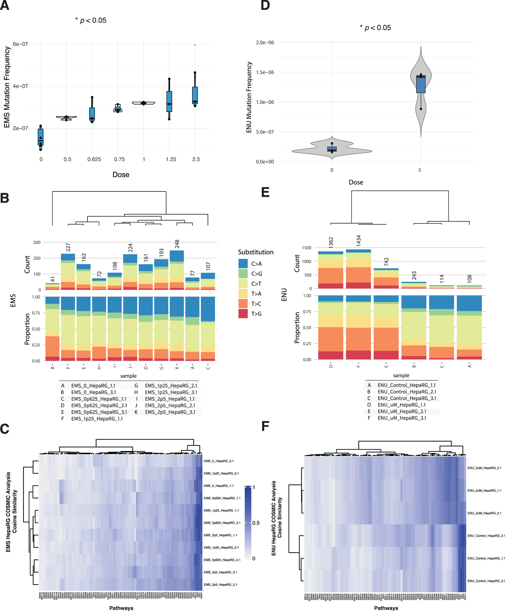 To evaluate the ability of DuplexSeq to quantify dose-responsive mutagenesis, HepaRG cells were treated with ethyl methanesulfonate (EMS) or N-ethyl-N-nitrosourea (ENU) across a range of concentrations followed by EC-NGS analysis of mutation frequency and signature profiles.