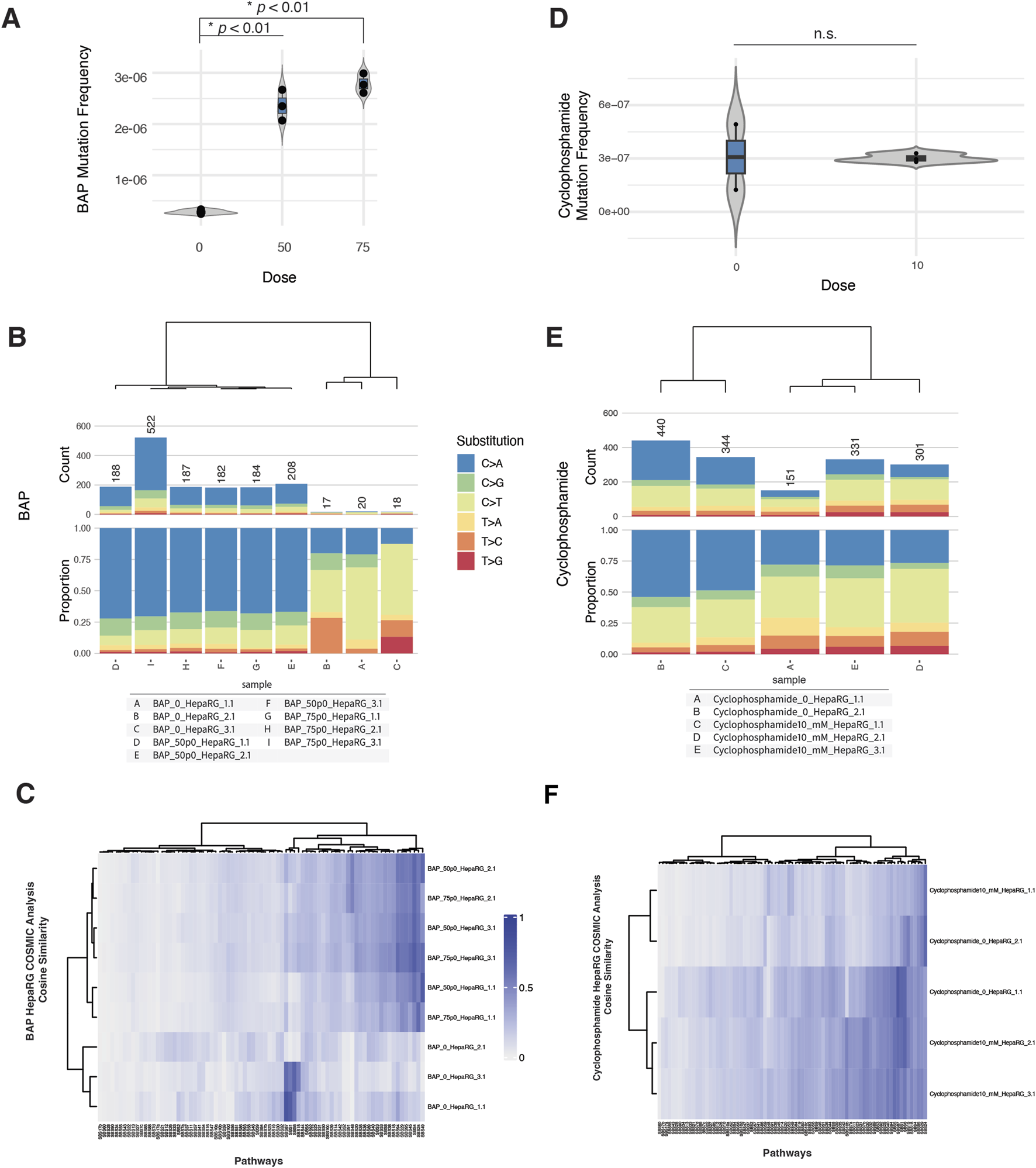 ecNGS and COSMIC profiling of mutagenic responses to benzo[a]pyrene (BAP) and cyclophosphamide (CPA). (A) Mutation frequencies in HepaRG™ cells after exposure to 50 and 75 μM BAP. (B) Base substitution spectra for BAP-treated samples showing predominance of C>A mutations, consistent with bulky adduct formation. (C) COSMIC signature enrichment heatmap for BAP-treated replicates, showing similarity to SBS4 and SBS29 (PAH-related mutational processes). (D) Mutation frequencies in cells exposed to 10 mM CPA, showing no consistent elevation over control levels. (E) Substitution spectra for CPA-exposed samples compared to background. (F) COSMIC signature similarity in CPA-treated samples, with weak enrichment in SBS5 and SBS87 (clock-like and thiopurine-associated processes).