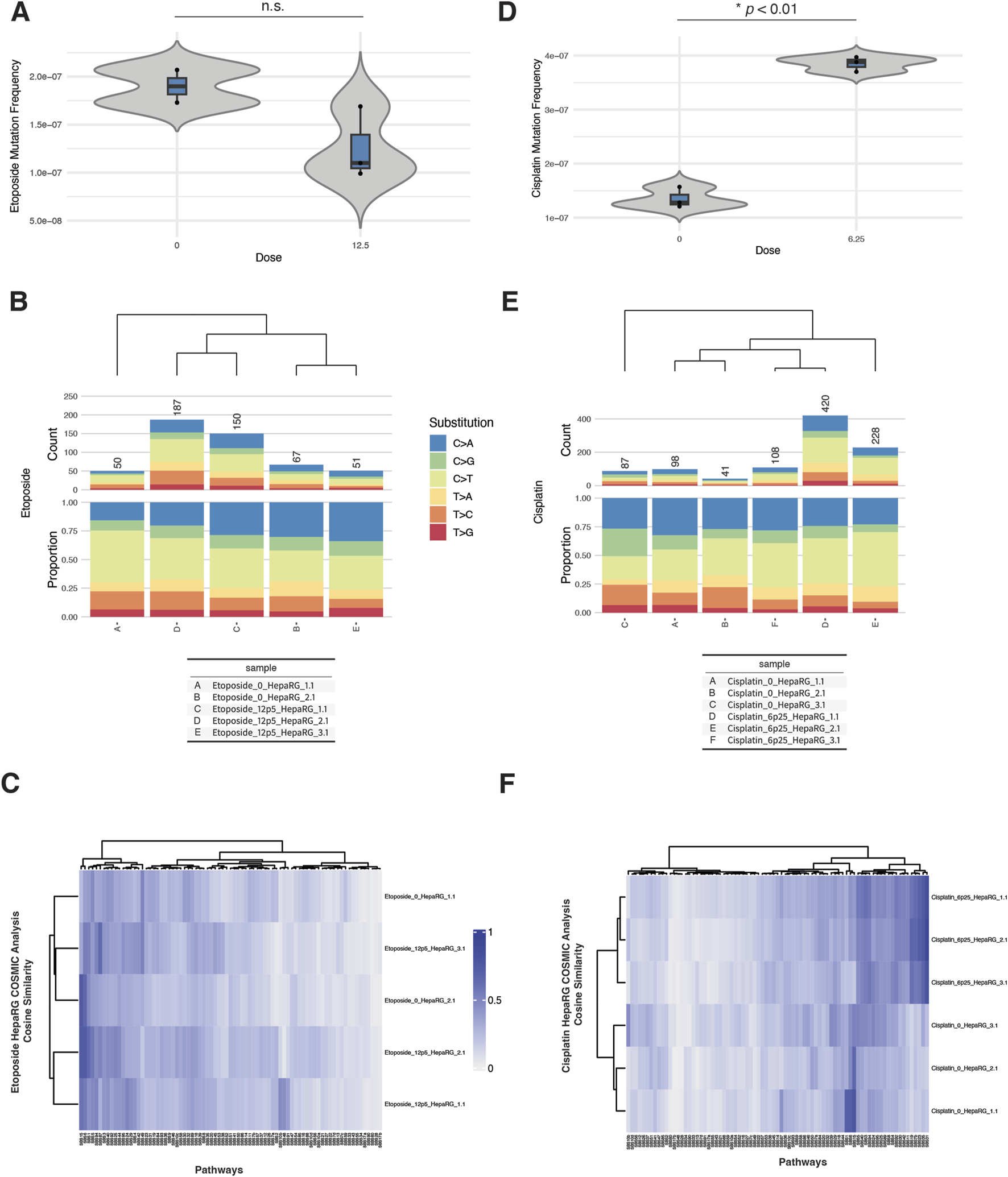 Taken together, etoposide and cisplatin produced detectable cytogenetic effects and weak increases in mutation frequency in HepaRG cells. COSMIC analyses identified plausible but non-dominant signature enrichment patterns consistent with known or chemically related mechanisms.