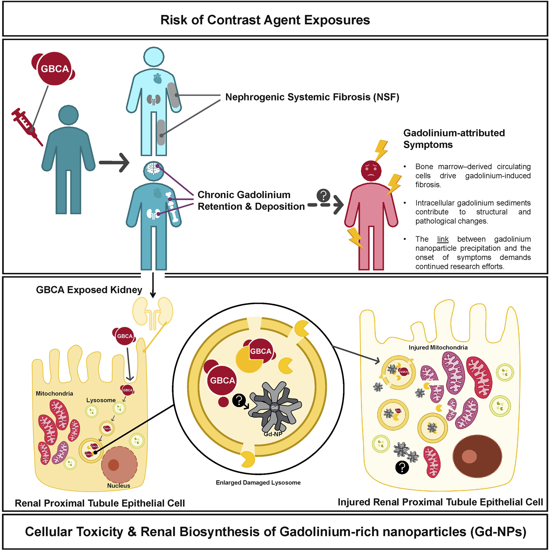 Chronic Gadolinium Deposition and Proposed Mechanisms of Pathophysiology. Gadolinium administration has been linked to the formation of nephrogenic systemic fibrosis and we list proposed mechanisms for the association between Gd contrast exposure and symptoms consistent with Gadolinium Deposition Disease. Intracellular mechanisms of gadolinium toxicity are shown in the lower panel which have also been associated with mitochondrial injury and other cellular damage.