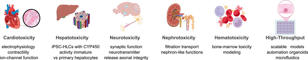 Figure 2 summarizes the current applications of hiPSC-derived cells in modeling toxicity across various organ systems. Specifically, hiPSC cardiomyocytes quantify proarrhythmic risk, including QT prolongation, hERG blockade, contractility deficits, and drug-induced arrhythmias (Visone et al., 2023). Moreover, hiPSC hepatocyte-like cells enable DILI assessment by capturing mitochondrial dysfunction, bile-acid transport defects, and broader metabolic toxicities (Tamargo-Rubio et al., 2023). Likewise, neural hPSC models (neurons and astrocytes) reveal seizure liability, neurodevelopmental perturbations, neurodegeneration, and synapto-toxicity (Tukker et al., 2019). In addition, kidney models composed of proximal tubule and podocyte lineages resolve filtration and transporter-mediated injuries typical of agents such as cisplatin and aminoglycosides (Lawrence et al., 2022). Similarly, hematopoietic progenitor systems detect marrow suppression, genotoxicity, and cytopenias (Fransen and Leonard, 2023). Finally, integrated platforms that combine organoids, micro-physiological chips, automation, and high-content phenotyping extend these assays to scalable safety pharmacology and compound prioritization (Vandana et al., 2023). Collectively, these human-relevant models increase mechanistic resolution and improve translational decision-making.