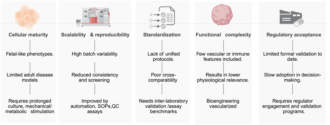 Nevertheless, despite these substantial advancements, the full translational and clinical potential of hiPSC-based platforms faces persistent challenges. Key issues include inherent variability between hiPSC lines due to differences in genetic background, reprogramming methods, and clonal selection processes. Additionally, standardized differentiation and assay protocols remain limited, complicating cross-study comparisons and regulatory acceptance. Another critical obstacle is the immature phenotype of hiPSC-derived cells, which often exhibit fetal or neonatal characteristics rather than fully mature adult functionalities, thereby limiting their predictive capabilities for chronic toxicities and adult-onset diseases (Volpato et al., 2018; Yang et al., 2014; OECD, 2018; Yip et al., 2023; Sewell et al., 2024).