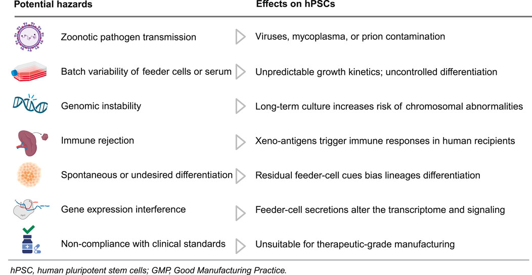 Table 1 summarizes the potential hazards of feeder cells and xenogeneic components in hPSC culture, detailing impacts on quality, safety, and translation. Feeder systems can introduce zoonotic contaminants, including viruses, mycoplasma, and prions (Cobo et al., 2005). This risk is compounded by batch-to-batch variability in feeders or serum that drives inconsistent proliferation kinetics and unscheduled differentiation, undermining assay reproducibility (Villa-Diaz et al., 2009; Ieyasu et al., 2017). Prolonged culture on animal-derived matrices further exacerbates instability by increasing chromosomal abnormalities and other genomic lesions (Mikkola et al., 2006), while incorporation of non-human sialic acids such as Neu5Gc heightens immunogenicity and the likelihood of rejection in human recipients (Martin et al., 2005). Persistent paracrine cues from feeder cells bias lineage specification, and undefined feeder-derived factors reshape transcriptomes and signaling networks, eroding phenotype fidelity (Shoji et al., 2018; Eiselleova et al., 2008; Wan et al., 2022). Because such xenogeneic systems are difficult to qualify under GMP, they remain unsuitable for therapeutic-grade manufacturing and regulated testing (Unger et al., 2008). Collectively, these considerations justify a transition to defined, xeno-free culture systems that support consistent expansion and translational testing of hPSCs.