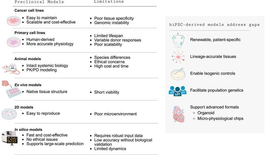 Table 13 summarizes the advantages and limitations of both conventional and computational preclinical models. Conventional models each add value yet leave key translational gaps. Cancer cell lines are scalable and low-cost for target-based assays but drift genomically and lack tissue specificity and human predictivity (Trastulla et al., 2022). Primary human cells benchmark physiology but are short-lived, donor-variable, and hard to scale (Bulutoglu et al., 2020). Animal models provide systemic biology and PK/PD context yet face interspecies differences, ethics, and high cost/time (Yang and Papoian, 2018). Ex vivo tissues preserve native architecture but have short viability and low throughput (Jin et al., 2021). Two-dimensional cultures are reproducible but are missing matrix, mechanical, and paracrine cues needed for microenvironment fidelity (Ware et al., 2015). In silico approaches are rapid and inexpensive but depend on high-quality training data, require experimental validation, and have limited dynamical realism (Fritsche et al., 2020). Human iPSC-derived models address these limitations by generating renewable, patient-specific, lineage-accurate tissues; enabling isogenic controls and population genetics; and supporting advanced formats— organoids and micro-physiological chips— that restore microenvironmental mechanics, multicellular interactions, and cross-tissue crosstalk, thereby improving mechanistic insight and human predictivity.