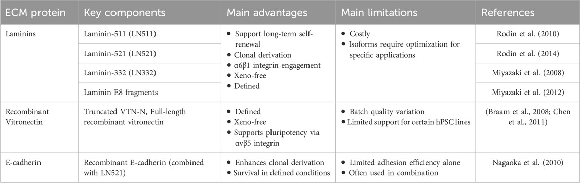 Recombinant human ECM proteins have proven effective as defined substrates (Table 4). Laminins and vitronectin are two key adhesion ligands for hPSCs. Among these, vitronectin and fibronectin were among the first applied, with defined fragments like vitronectin-N supporting hPSC adhesion via αvβ5 integrins and maintaining self-renewal in xeno-free conditions (Braam et al., 2008). However, both vitronectin and fibronectin may show lower attachment efficiency or require higher coating concentrations compared to Matrigel (Badenes et al., 2016). In contrast, laminin-511 and laminin-521—basement membrane proteins expressed in the embryonic inner cell mass and placenta—more closely replicate the native hPSC niche (Xu et al., 2001). Laminin-511 supports long-term self-renewal (Rodin et al., 2010), while laminin-521 promotes single-cell survival (Rodin et al., 2014), clonal expansion, and sustained pluripotency. These substrates act primarily through α6β1 integrin signaling in hPSCs (Villa-Diaz et al., 2016) and are commercially available in defined, clinical-grade formats (e.g., iMatrix-511), making them widely used in GMP-compliant protocols for hiPSC expansion and directed differentiation.