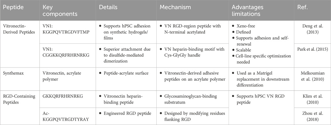 On the other hand, synthetic peptide-based substrates have emerged as defined and xeno-free alternatives to traditional extracellular matrix coatings for hPSC culture (Table 5). Vitronectin-derived peptides such as VN1:KGGPQVTRGDVFTMP (Deng et al., 2013), VN2: CGGKKQRFRHRNRKG (Park et al., 2015), and commercially available Synthemax (a vitronectin peptide–acrylate conjugate) (Melkoumian et al., 2010) support robust cell adhesion, self-renewal, and long-term maintenance of pluripotency under feeder-free conditions. These substrates are scalable and chemically defined, making them well-suited for research and preclinical applications (Badenes et al., 2014). However, their performance may vary across different hPSC lines and often requires optimization. RGD-containing peptides, including heparin-binding variants GKKQRFRHRNRKG (Klim et al., 2010) and optimized vitronectin mimetics (e.g., Ac-KGGPQVTRGDTYRAY) (Zhou et al., 2018) function by mimicking natural integrin-binding domains to promote cell attachment and survival. While promising for translational use, these systems are sensitive to peptide density and conformation, which may affect reproducibility. Overall, synthetic peptide substrates represent a critical step toward standardized, xeno-free platforms for hPSC expansion and differentiation.