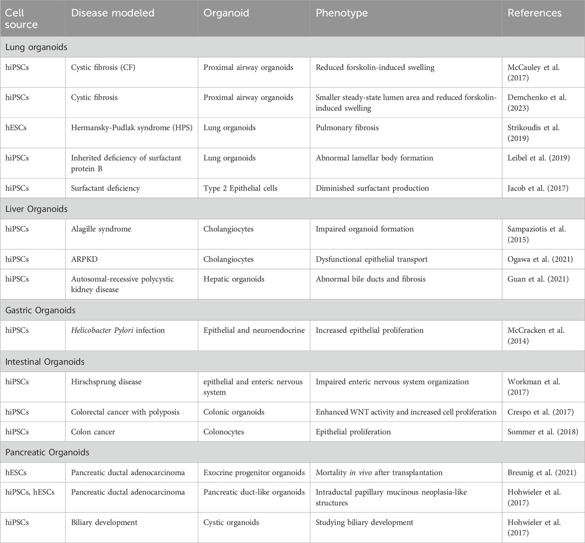 As summarized in Tables 9–11, diverse organoid systems have been established for diseases of endodermal, mesodermal, and ectodermal origins, including lung, liver, gastric, intestinal, pancreatic organoids, cardiac, renal-nephrotic, muscular organoids/spheroid, brain, cerebral, retinal, spinal organoids. In addition to organoids following are examples of popular disease modeling: ARPKD disease models, Polycystic Kidney Disease, Seckel syndrome, Miller-Dieker lissencephaly, Alzheimer’s disease, Fragile X syndrome, Leigh syndrome, Parkinson’s disease, Rett syndrome, FTD, Spinal muscular atrophy, Glaucoma, RP, FRD, altogether demonstrating the versatility and precision of this modeling approach.
