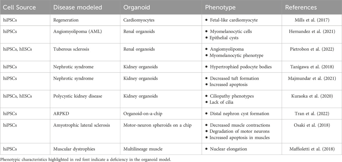 Table 10. Overview of key hPSC-derived organoids in disease research and modeling of mesoderm origin.