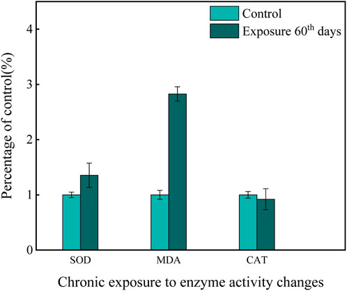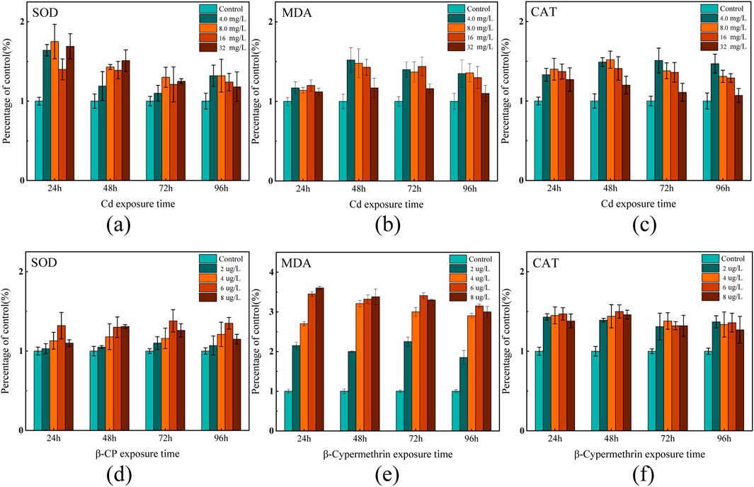 Oxidative stress results from an imbalance between the production of reactive oxygen species (ROS) and the antioxidant defenses of an organism. This imbalance leads to oxidative damage of cellular components such as lipids, proteins, and DNA. Various environmental contaminants can induce oxidative stress in non-target organisms, thereby elevating ROS levels (Chen et al., 2023a; Forman and Zhang, 2021; Mittler et al., 2022; Sies et al., 2022). To counteract oxidative damage, organisms utilize antioxidant enzymes such as catalase (CAT) and superoxide dismutase (SOD); CAT facilitates the breakdown of hydrogen peroxide into water and oxygen, while SOD catalyzes the dismutation of superoxide radicals into oxygen and hydrogen peroxide. (Engelbrecht et al., 2023). Consequently, the enzymatic activities of CAT and SOD, which directly neutralize ROS, along with the concentration of malondialdehyde (MDA), a terminal product of lipid peroxidation, are extensively utilized as synergistic biomarkers to comprehensively assess oxidative stress levels, antioxidant defense capacity, and the extent of environmental pollution (Xu et al., 2023; Zamora et al., 2023).