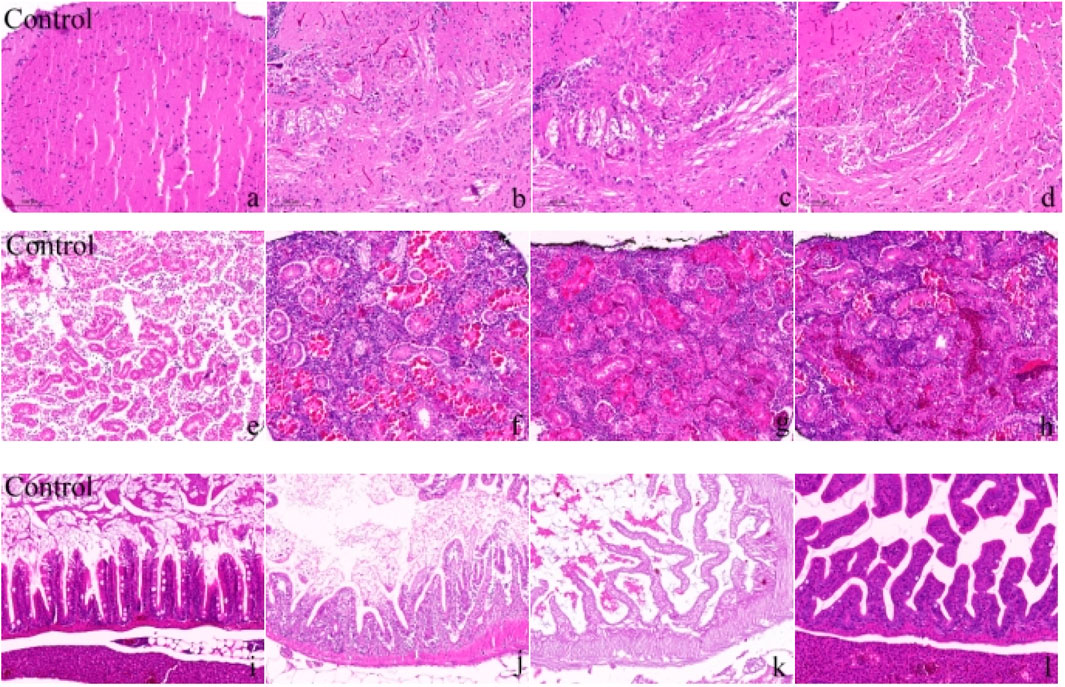 Figure 3. Morphological changes in the brain, liver, and intestine of zebrafish after 60 days of chronic exposure to the mixed solution (a–d) show the changes in zebrafish brain tissue; (e–h) show the changes in zebrafish liver tissue; (i–l) show the changes in zebrafish intestinal tissue). Scale bar in all panels represents 50 μm.