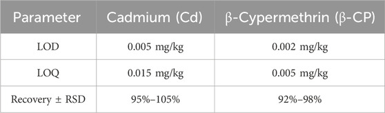 Detection of β-CP in Fish: Approximately 0.1 g of zebrafish liver, intestinal, and brain tissue samples were collected and finely ground under liquid nitrogen to obtain a homogeneous powder. Ultrasonication-assisted extraction was performed on the powdered samples using 10 mL of acetonitrile for 20 min, followed by centrifugation at 4,000 rpm for 10 min to separate the supernatant. The supernatant underwent further purification via a solid-phase extraction (SPE) column, after which the eluate was concentrated to dryness and reconstituted in 1 mL of acetonitrile. Analysis of β-CP was conducted using liquid chromatography-tandem mass spectrometry (LC-MS) on a C18 reversed-phase column, employing a mobile phase gradient and an electrospray ionization source in positive ion mode for enhanced mass spectrometry sensitivity. Detection was performed in multiple reaction monitoring (MRM) mode to target specific ion pairs of β-CP, with the detection wavelength optimized at 230 nm. Quantitative assessment was achieved via the internal standard method, allowing precise calculation of β-CP concentrations in the samples. The key method validation parameters for the determination of Cd and β-CP are summarized in Table 1.