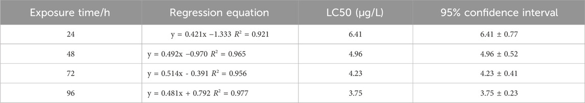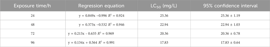 The LC50 values for Cd and β-CP were estimated using Probit regression analysis. To enhance the robustness of the results, 95% confidence intervals were calculated and reported for each LC50 value, indicating the precision and reliability of the toxicity estimates.