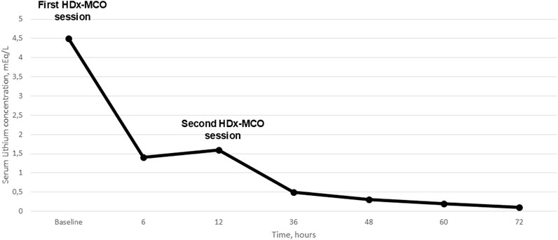 Lithium’s low molecular weight, small volume of distribution, and minimal protein binding enable efficient plasma clearance by hemodialysis (Decker et al., 2015; King et al., 2019). However, unlike most toxins, lithium redistributes from intracellular compartments to plasma through sodium channels, resulting in slower equilibration compared to substances that diffuse freely across membranes. Consequently, multiple hemodialysis sessions are often required due to plasma lithium rebound occurring hours post-treatment (Decker et al., 2015; King et al., 2019). In this case, serum lithium was measured before and after each HDx-MCO session, with no rebound observed.