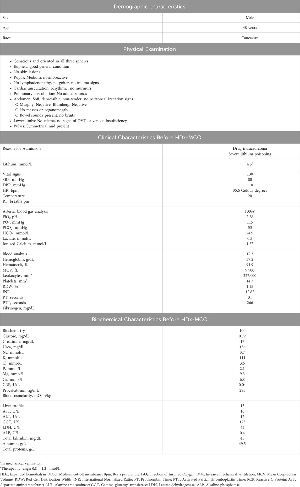 In this case, an HDx-MCO membrane (Theranova®; Baxter International Inc., Deerfield, IL, USA) was employed for lithium removal. Given lithium’s low molecular weight, limited volume of distribution, and minimal protein binding, it is well-suited for clearance via HDx-MCO (Mitchell et al., 2023; Kawanishi, 2024). Compared to conventional high-flux hemodialysis and hemodiafiltration, HDx-MCO offers enhanced elimination of larger middle molecules while reducing albumin loss (Mitchell et al., 2023; Kawanishi, 2024). A recent meta-analysis confirmed superior clearance of κ and λ free light chains with HDx-MCO and emphasized its improved albumin preservation relative to hemodiafiltration (Zhao et al., 2022).