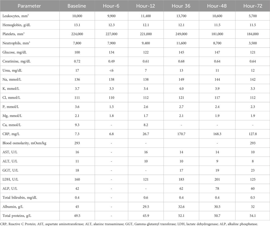 Table 2 details the progression of critical biochemical markers monitored throughout the patient’s clinical course.