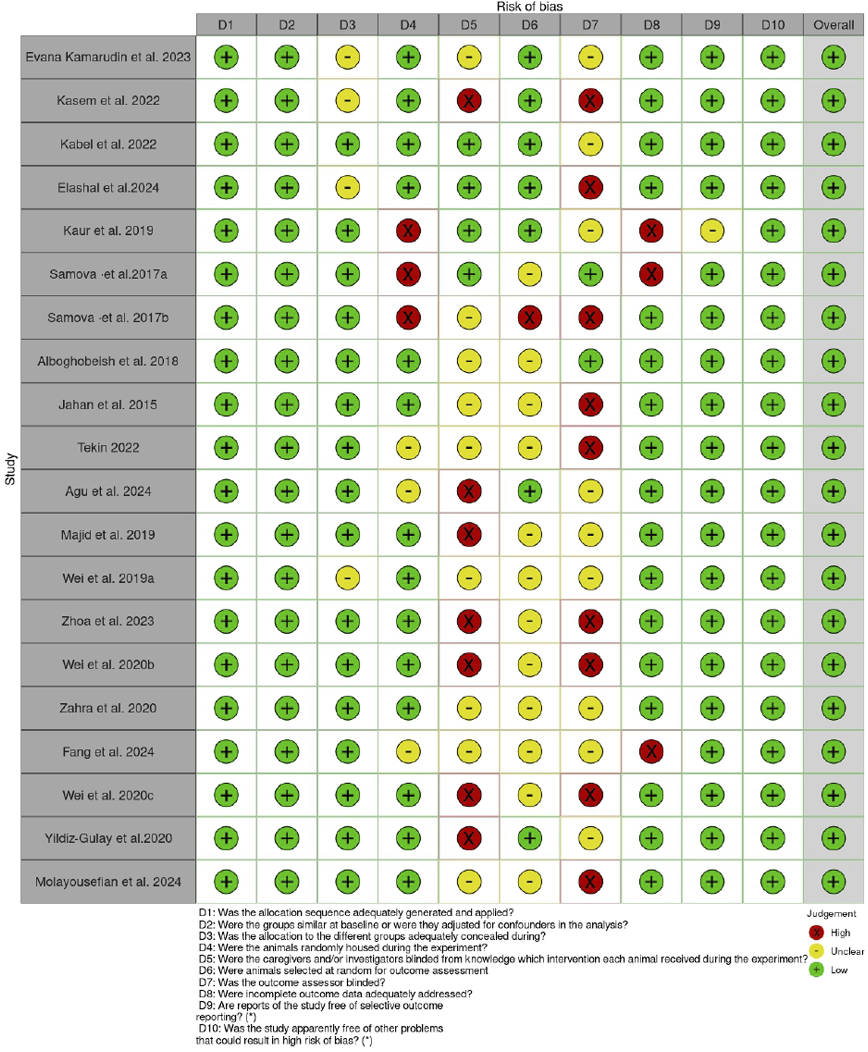 The Systematic Review Center for Laboratory Animal Experimentation (SYRCLE) Checklist for in vivo research was used to assess the risk of bias (Hooijmans et al., 2014). The ROBVIS (Risk-Of-Bias VISualization) tool was used to present the outcome of the risk of bias assessment, as shown in Figures 1, 2.