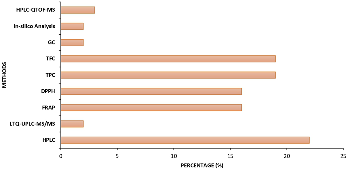 The data presented in Figure 4 illustrate the regional contributions to research on the use of flavonoids in mitigating BPA-induced toxicity. The figure reveals that a substantial proportion of the studies were conducted in China, followed by India, Iran, Egypt, and Nigeria. Additionally, Figure 5 depicts the percentage distribution of phytochemical analysis methods such as high-performance liquid chromatography quadrupole time-of-flight mass spectroscopy (HPLC-QTOF-MS), in silico analysis, gas chromatography (GC), total flavonoid content (TFC), total phenolic content (TPC), 2,2-Diphenyl-1-picrylhydrazyl (DPPH), ferric reducing antioxidant power (FRAP), linear trap quadupole-ultra-high performance liquid chromatography-mass spectroscopy (LTQ-UPLC-MS/MS), and HPLC employed in the reviewed studies. Notably, HPLC dominates the phytochemical analysis approaches reported in the study.