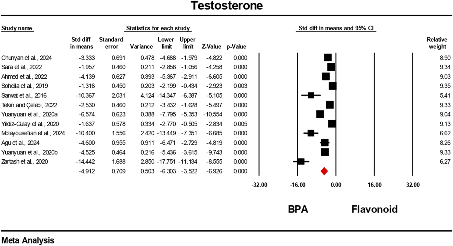 Using PRISMA 2020 guidelines, Web of Science, Scopus, and PubMed were searched up to September 2024. Eligible studies involved BPA exposure in male rodents with flavonoid co-treatment and reported reproductive endpoints. Hormonal and oxidative stress biomarkers were pooled using a random-effects model, expressed as standardized mean differences (SMDs), with heterogeneity assessed by I2 statistics. Twenty studies were included.