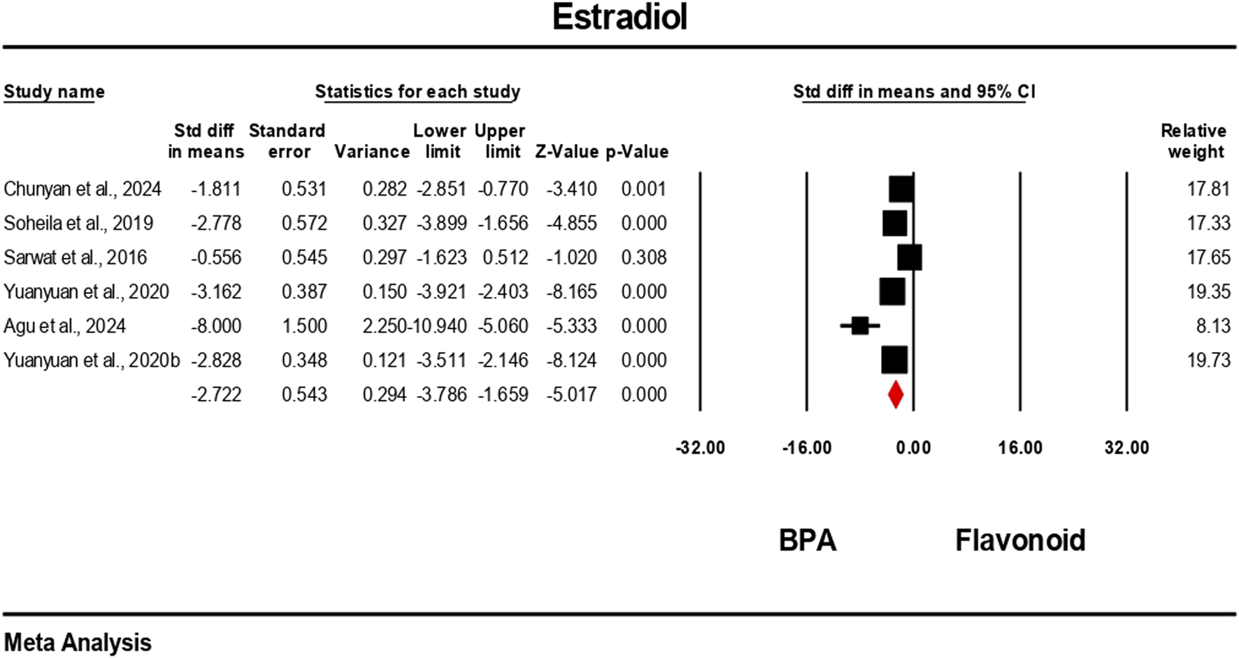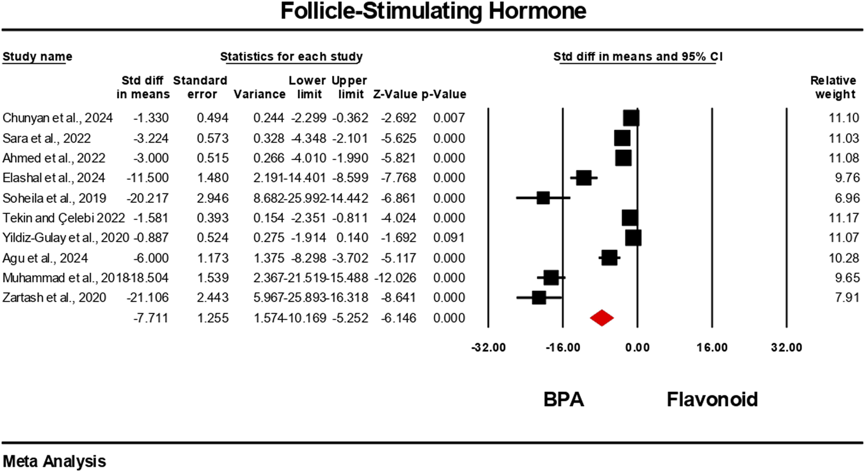 Flavonoid co-treatment significantly improved hormonal profiles and oxidative balance, with the greatest recovery in FSH. High heterogeneity (I2 > 84%) reflected variability in doses, treatment duration, compound purity, and species. Flavonoids exhibit marked ameliorative potential against BPA-induced reproductive toxicity in preclinical models, largely through hormonal regulation and oxidative stress mitigation. Standardized protocols and dose–response studies are essential to enhance reproducibility and translational relevance.