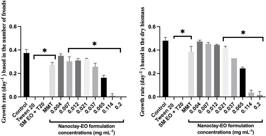 Figure 4. Average growth rate of Lemna minor based on the number of fronds (left) and dry biomass (right) after 7 days exposure to increasing concentrations of the nanoclay-EO formulation and the highest concentration of its individual components [(EO (0.2 mg mL-1), Tween 20® (0.2 mg mL-1), MMT (5 mg mL-1)] for 7 days. SM EO + T20-S. montana EO + Tween 20®; MMT- Montmorillonite. Error bars represent the standard deviation. Asterisks denote significant differences between the treatments and the control (level of significance p < 0.05).
