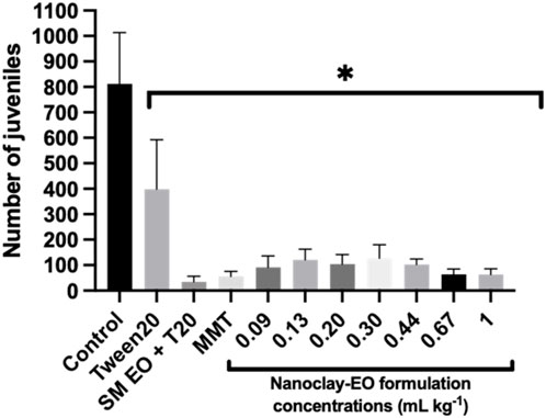 Bar chart showing the number of juveniles by different treatments and concentrations. Control has the highest count, followed by Tween20 and SM EO + T20. Other samples, including MMT and various Nanoclay-EO concentrations (0.09 to 1 mL/kg), have significantly lower counts. An asterisk indicates statistical significance between groups.