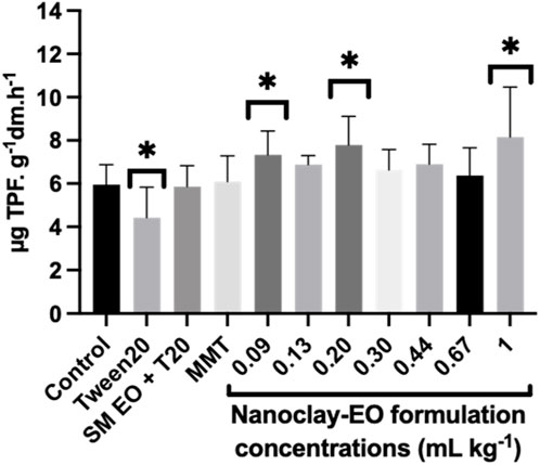 Soil dehydrogenases activity is an excellent indicator of overall metabolic activity of a vital soil microbial community as these enzymes are part of respiratory chain of microbial cells (Doi and Ranamukhaarachchi, 2009). The addition of organic sources, if not toxic, could enhance the amount of soil substrate that the microbial population can mineralize, as expressed by an increased activity of dehydrogenases (Adak et al., 2014). Therefore, this can explain the stimulatory effect observed, at least at some concentrations of the nanoclay-EO formulation tested, since the EO can act as a natural carbon source for the microbial community (Figure 9). Moreover, the presence of phenols in S. montana EO can also explain the stimulatory effect seen for this enzyme activity, which was previously noted as well by Zhou and Wu, (2012). When compared to the soil only moisturized with water (1.21 ± 0.04 µg TPF g-1 soil 24 h-1), the dehydrogenase activity in the same soil, containing a mixture of phenolic compounds, showed a significantly higher dehydrogenase activity (2.93 ± 0.22 µg TPF g-1 soil 24 h-1). Additionally, Chalkos et al. (2021) also found that the enrichment of soils with different textures, from various ecosystems (oak forest, mixed deciduous forest, riparian forest, phrygana, sandy shore and desert), with monoterpenes - the major constituents of SM EO - increased soil respiration and bacterial community density (Chalkos et al., 2021). Our results were also consistent with previous studies, which observed an increase in soil respiration under the exposure to EO with different chemical composition (Vokou and Liotiri, 1999; Vokou et al., 2002) and to different EO components (Vokou and Margaris, 1988). Vokou et al. (2002) also concluded that this enhancement was mainly a primary effect, resulting from the use of EO as a carbon and energy source by tolerant bacteria (e.g., Pseudomonas). The increase in soil respiration was concomitantly observed by these authors with an enhancement of soil bacterial colonies.
