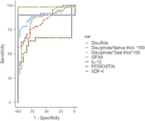 Figure 1. ROC curves of selected biochemical parameters for predicting scorpion sting cases. Abbreviations: SDF-4, Stromal Cell-Derived Factor 4; IL-13, Interleukin-13; GPX4, Glutathione Peroxidase; Var, variable.