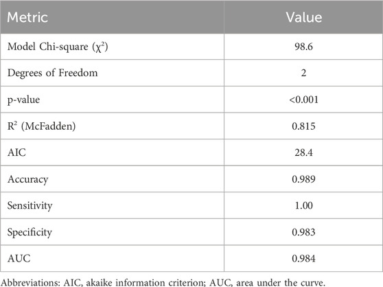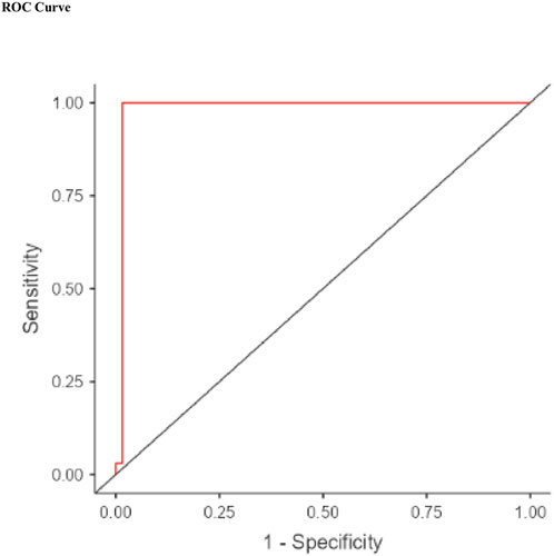 Binomial logistic regression analysis identified disulfide (β = −0.2075, p = 0.030) and GPX4 (β = −0.0590, p < 0.001) as independent predictors of scorpion envenomation. Despite higher disulfide levels in patients, the negative β in the logistic model likely reflects the binary coding structure (1 = control, 0 = envenomated), where increasing disulfide values decrease the odds of being in the control group. The regression model demonstrated excellent fit and performance, with a chi-square value of 98.6 (p < 0.001), McFadden’s R2 of 0.815, and an AIC of 28.4. The model correctly classified 98.9% of cases, with a sensitivity of 1.00 and specificity of 0.983 (Table 7). The corresponding ROC curve illustrated the model’s high discriminative power with an AUC of 0.984 (Table 8; Figure 3).