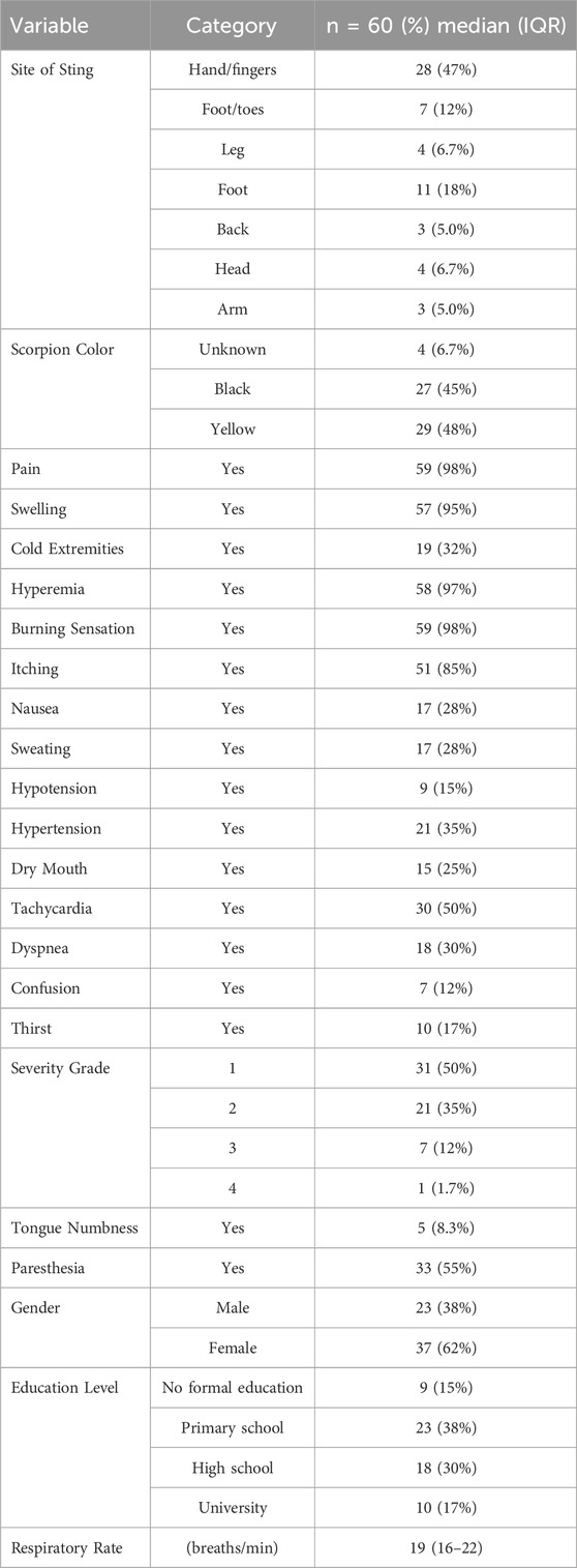 Comparative analyses between patients with confirmed scorpion sting and those without were performed using the Mann–Whitney U test for skewed continuous variables, and the Pearson chi-square or Fisher’s exact test for categorical comparisons, depending on cell counts.