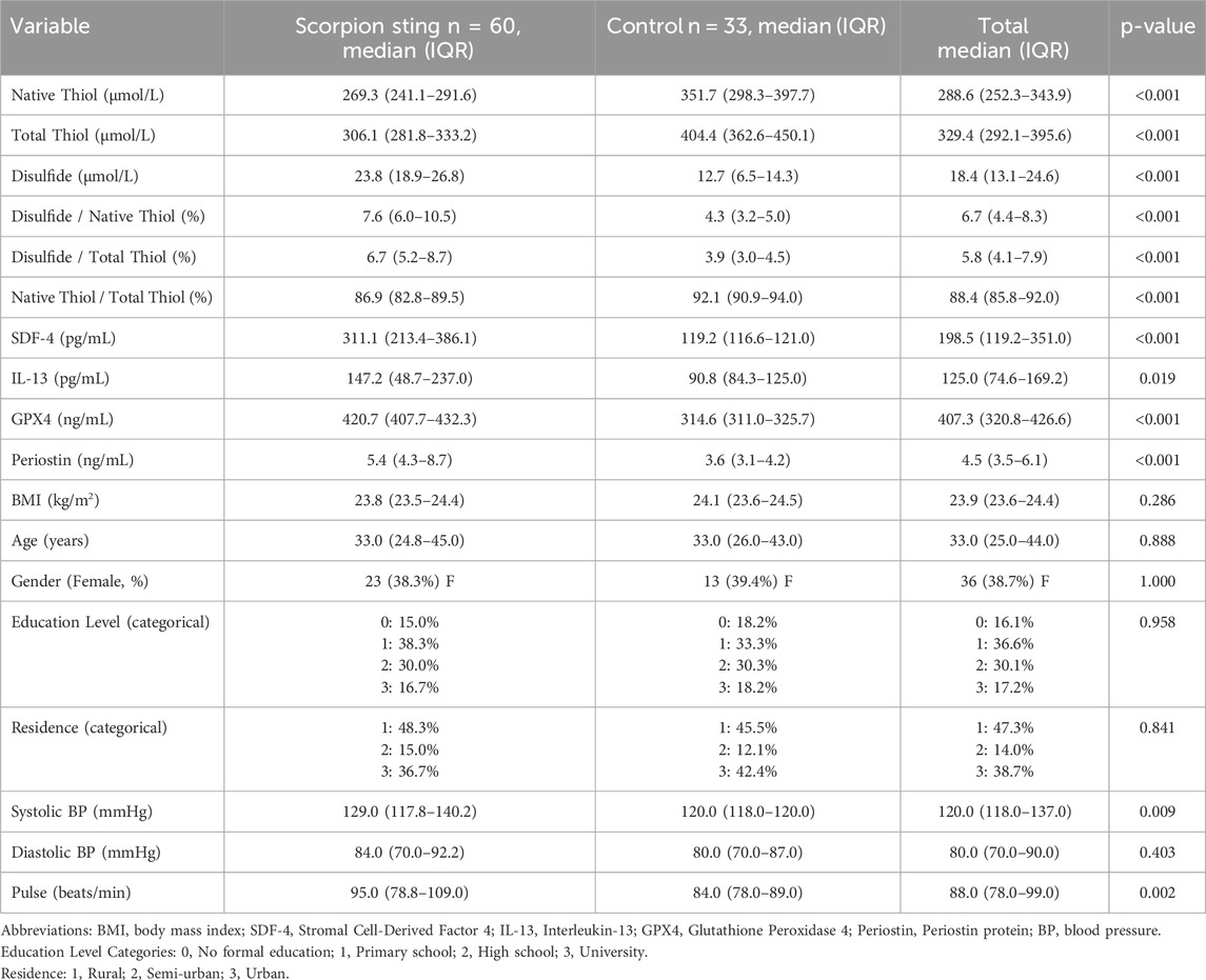 A total of 60 patients with confirmed scorpion envenomation and 33 healthy individuals without envenomation were included in the study. Detailed clinical characteristics of the scorpion sting cases are presented in Table 1. The median age was 33.0 years (IQR: 25.0–44.0), with no statistically significant difference between groups regarding age or gender distribution (p > 0.05). Biochemical parameters revealed significant alterations in the scorpion sting group. Patients exhibited lower levels of native thiol (269.3 μmol/L vs. 351.7 μmol/L, p < 0.001) and total thiol (306.1 μmol/L vs. 404.4 μmol/L, p < 0.001), alongside elevated levels of disulfide (23.8 μmol/L vs. 12.7 μmol/L, p < 0.001). In the envenomated group, disulfide/native thiol and disulfide/total thiol ratios were significantly higher, while GPX4 levels were significantly lower compared to the control group (p < 0.001).
