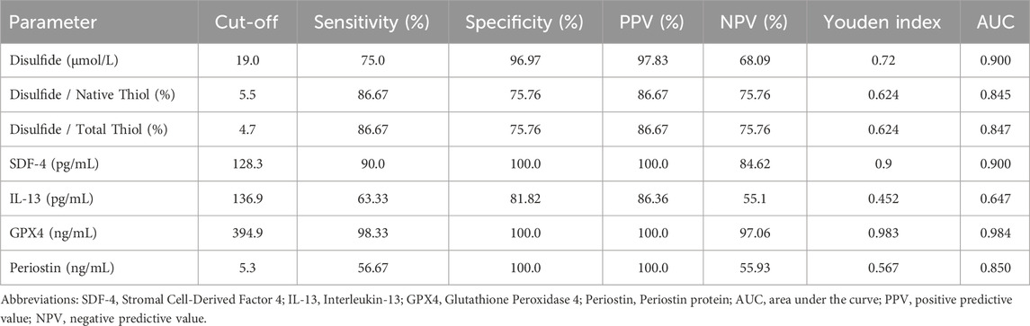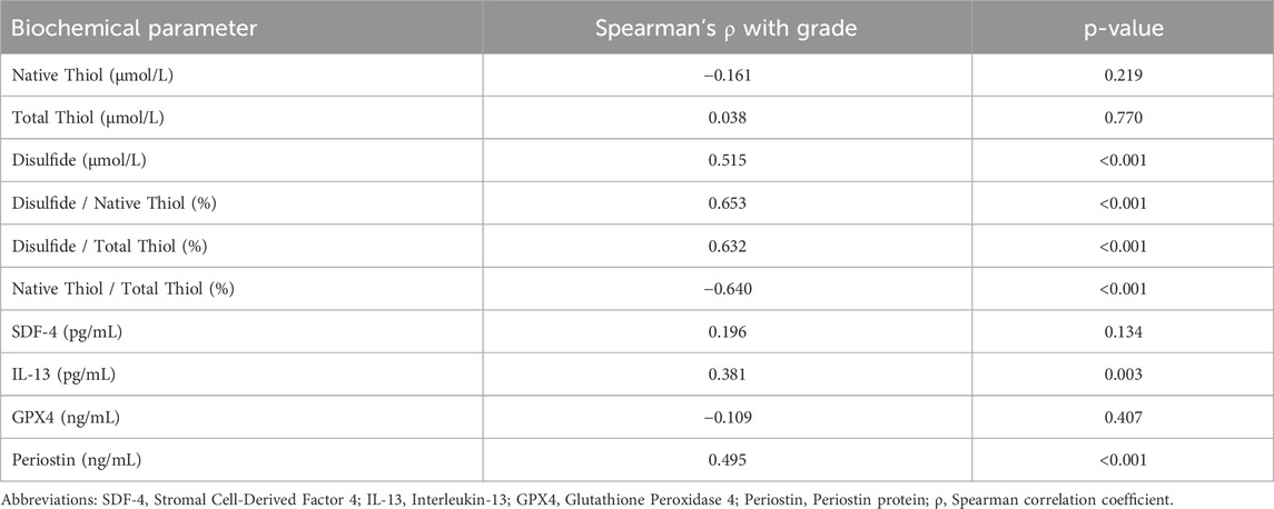 Correlation analysis between biochemical markers and clinical severity grade revealed significant associations. Disulfide (r = 0.515, p < 0.001), disulfide/native thiol (r = 0.653, p < 0.001), disulfide/total thiol (r = 0.632, p < 0.001), and periostin (r = 0.495, p < 0.001) demonstrated positive correlations with clinical severity. Conversely, native thiol (r = −0.161, p = 0.223) and GPX4 (r = −0.109, p = 0.407) showed weak negative correlations, but these were not statistically significant (Table 5).
