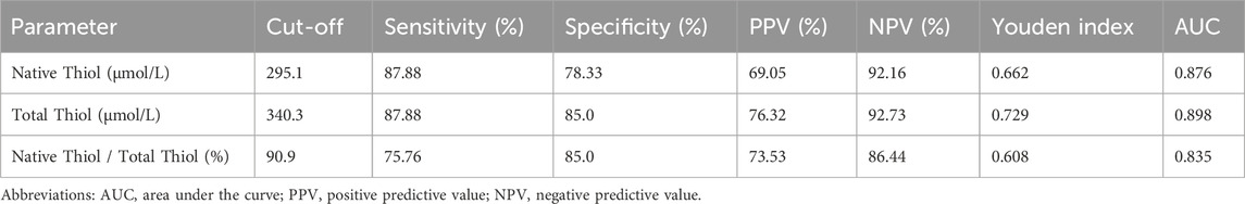 ROC curve analysis demonstrated high diagnostic accuracy for several parameters. GPX4 (AUC = 0.984), SDF-4 (AUC = 0.900), periostin (AUC = 0.850), and the disulfide/native thiol ratio (AUC = 0.845) were the most reliable predictors for distinguishing envenomated patients from controls. Youden index-based optimal cut-off values further supported their predictive utility (Table 3; Figure 1). Notably, GPX4 had a sensitivity and specificity of 100% and 93.3%, respectively. Parameters with high negative predictive value included native thiol (AUC = 0.876) and total thiol (AUC = 0.898), which were effective for excluding scorpion sting when above their respective thresholds (Table 4; Figure 2).