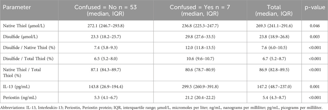When patients were divided based on the presence of confusion (n = 7 vs. n = 53), significantly lower GPX4 and thiol levels and higher disulfide, IL-13, periostin, and SDF-4 levels were observed in the confused group (p < 0.01 for all comparisons) (Table 6).