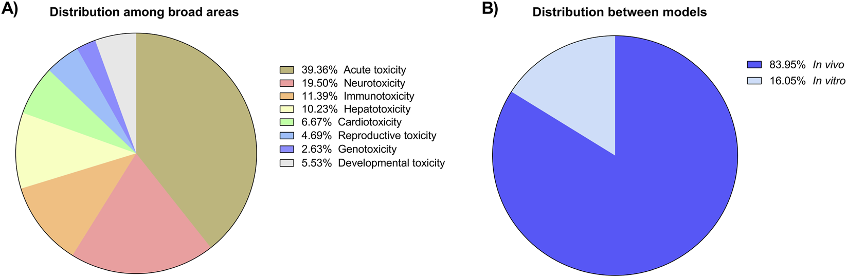(A) Distribution of articles among the main toxicity areas evaluated in zebrafish, highlighting the predominance of acute toxicity studies (39.58%), followed by neurotoxicity (19.61%), immunotoxicity (11.45%), hepatotoxicity (10.29%), cardiotoxicity (6.71%), reproductive toxicity (4.72%), genotoxicity (2.65%) and Developmental Toxicity (5,56%). (B) Distribution of studies according to the experimental model, showing a higher proportion of in vivo (84%) compared to in vitro studies (16%).