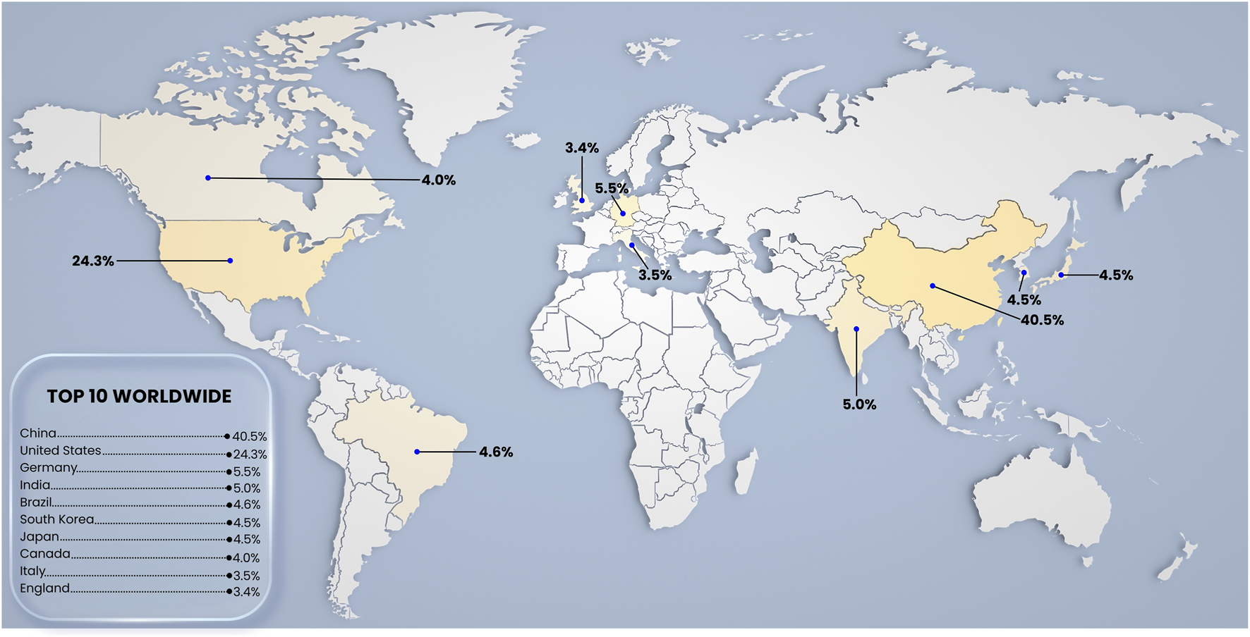 Geographic distribution of publications in toxicology using zebrafish. The map highlights the ten countries with the greatest scientific contribution, led by the China (40.5%), United States (24.34%), followed by German (5.52%), India (5.04%), Brazil (4.58%), South Korea (4.53%), Japan (4.48%), Canada (4.09%), Italy (3.47%), and England (3.46%).