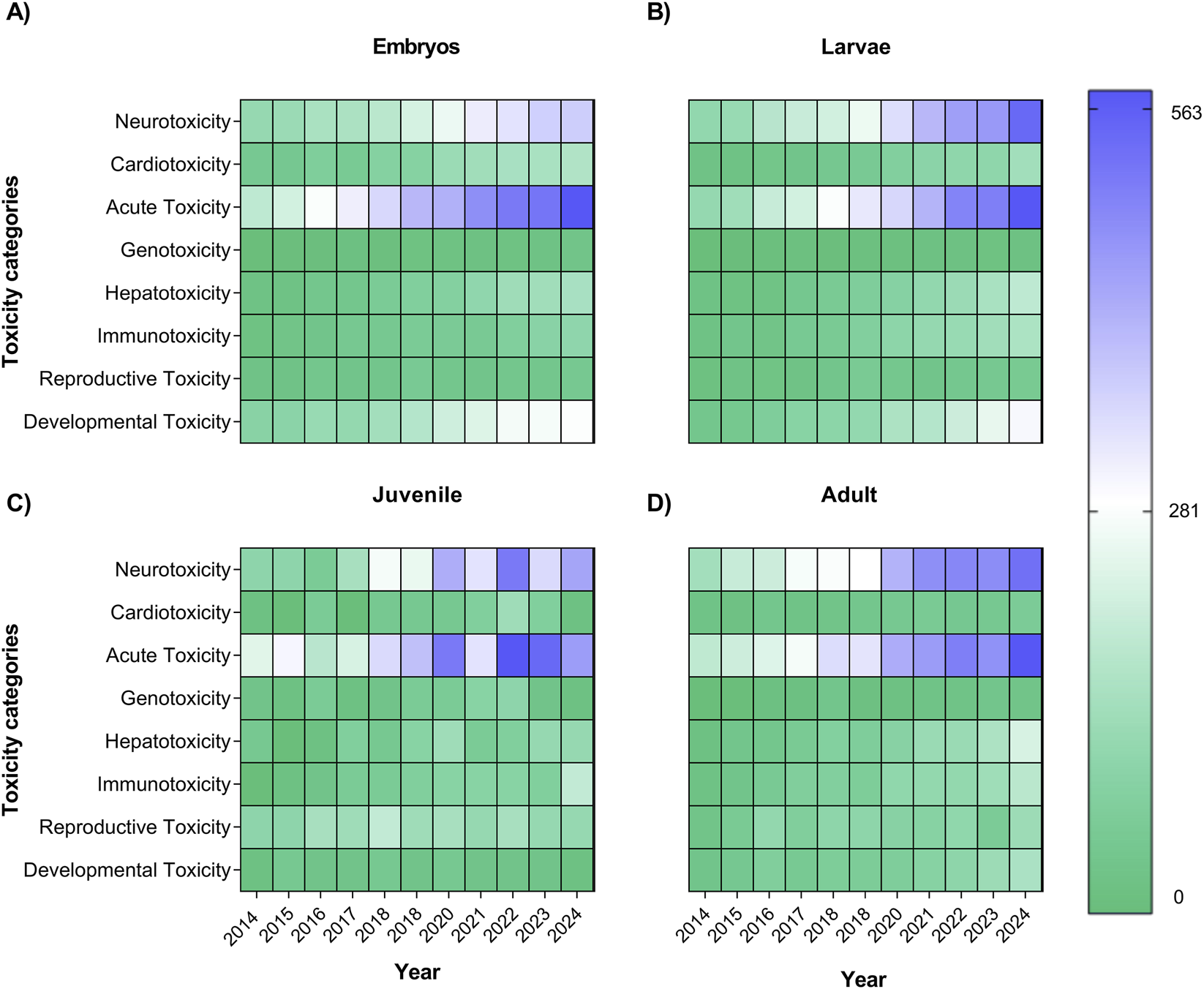 To further investigate the temporal evolution of zebrafish toxicology research, we analyzed the interaction between developmental stage and publication year (Figure 6). The heatmap reveals that studies involving embryos (Figure 6A) have progressively increased over the past decade, while investigations focusing on adults remained comparatively stable (Figure 6D). The larvae (Figure 6B) and juvenile (Figure 6C) have increased to neurotoxicity and acute toxicity since 2023. This trend highlights a growing preference for early-life exposure models, likely due to their higher experimental throughput, transparency, and relevance for developmental and mechanistic assessments.