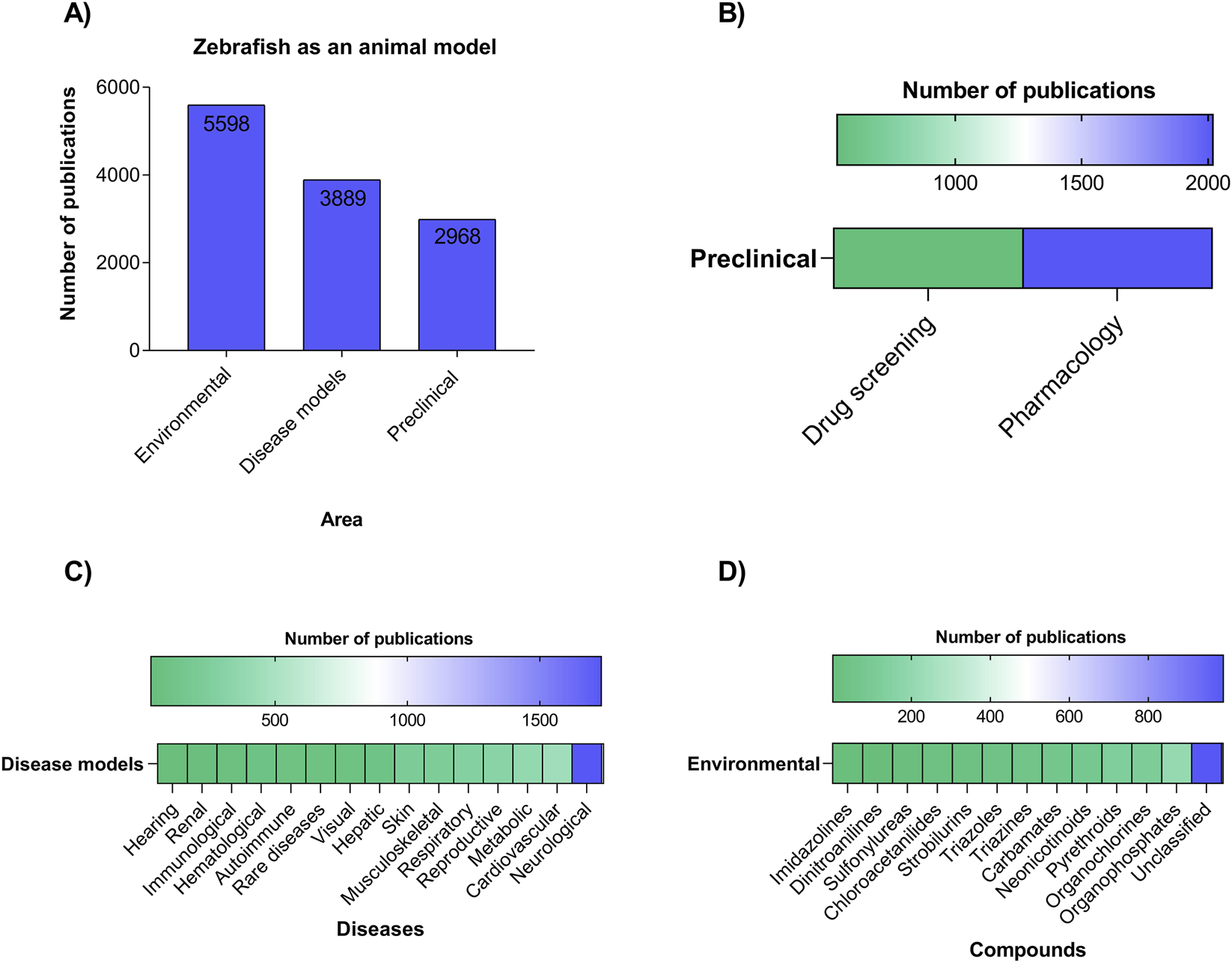 (A) General categories in which zebrafish are used as an experimental model, including environmental studies, disease modeling, and preclinical applications. (B) Classification of environmental compounds investigated, showing a predominance of organophosphates, organochlorines, and unclassified compounds. (C) Distribution of disease models evaluated, with an emphasis on neurological, cardiovascular, and metabolic conditions. (D) Preclinical applications of zebrafish, highlighting pharmacological and drug screening approaches.